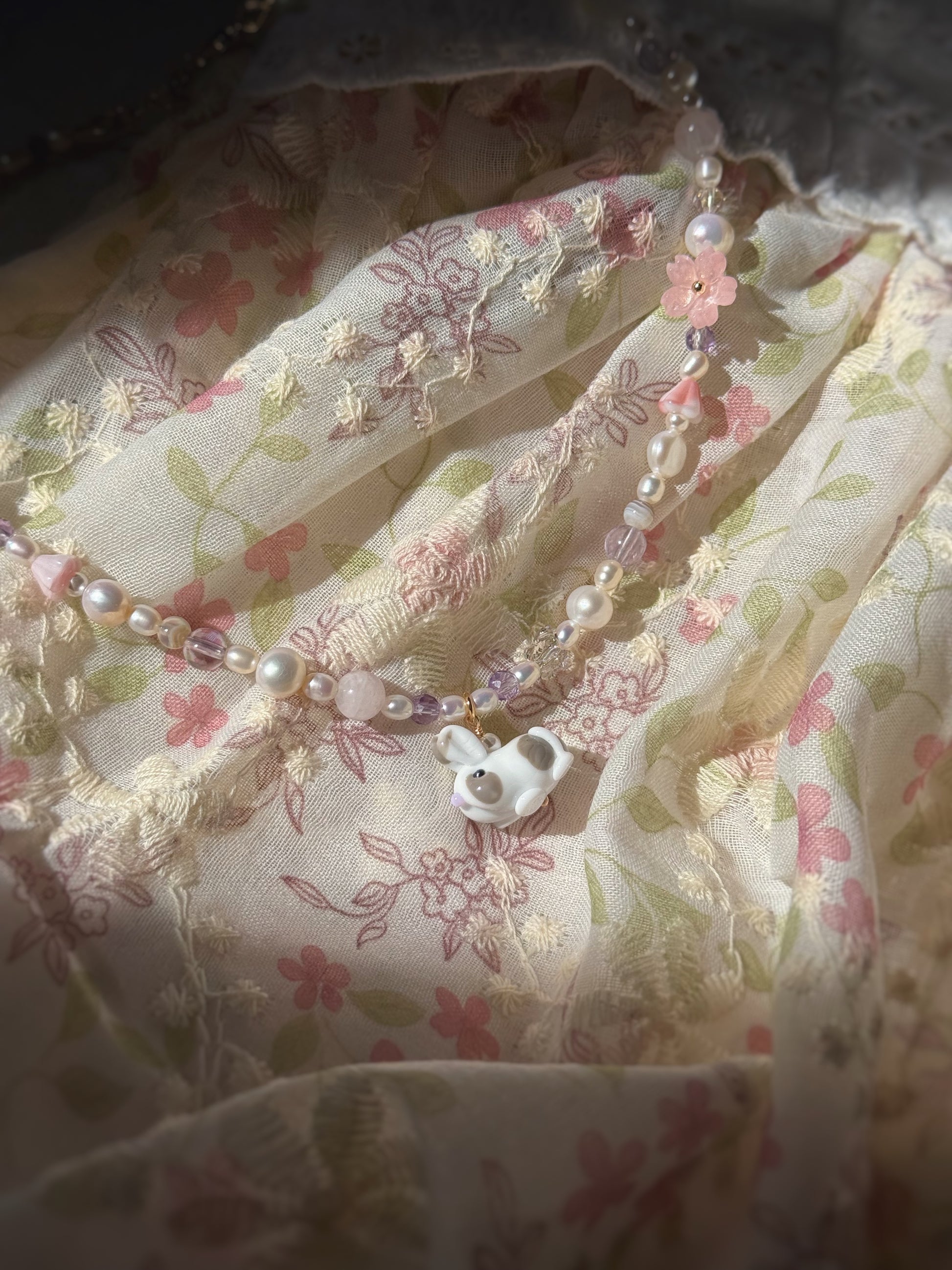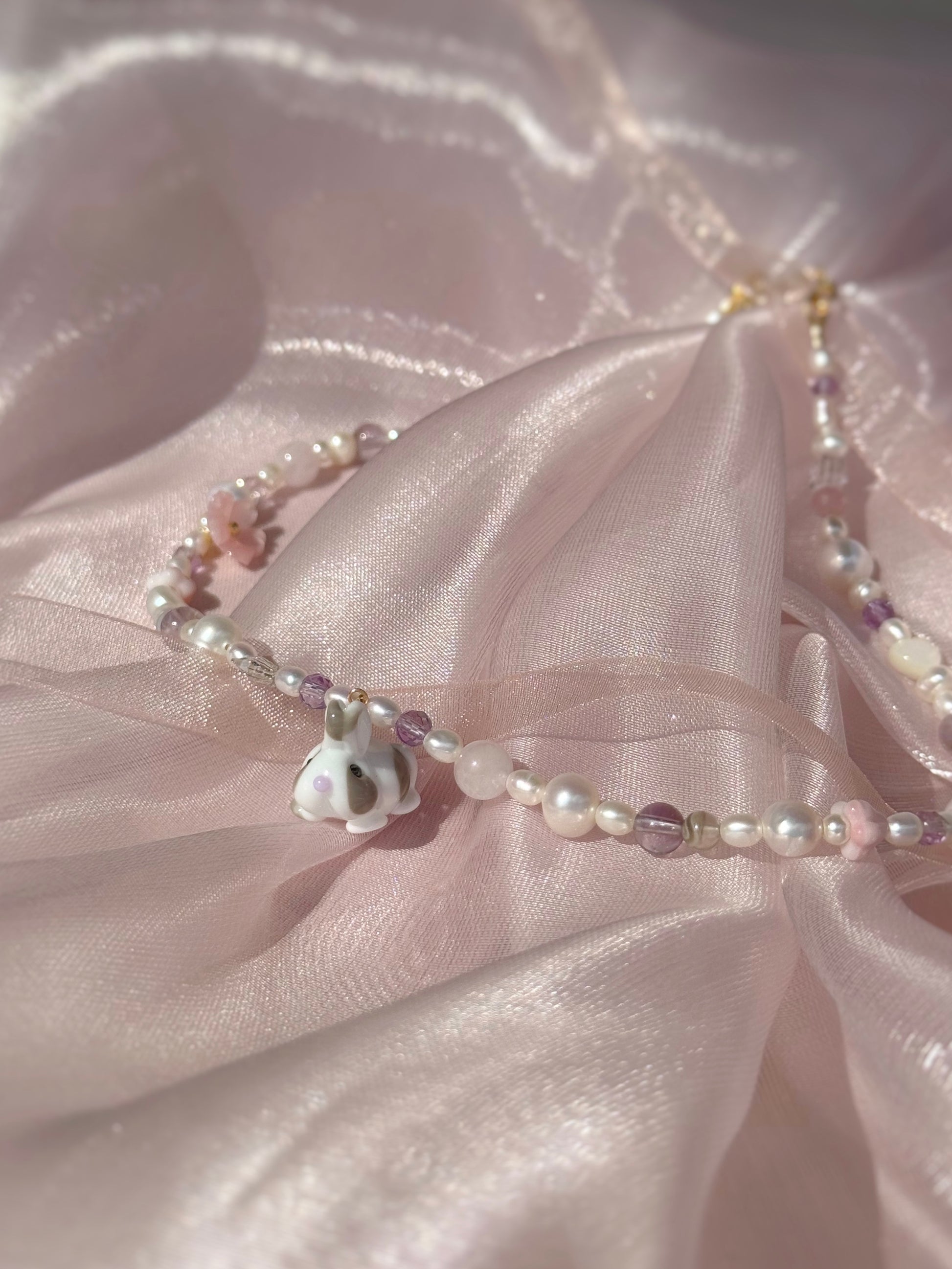 Made with a lampwork glass bunny, pearls, crystal gemstones.