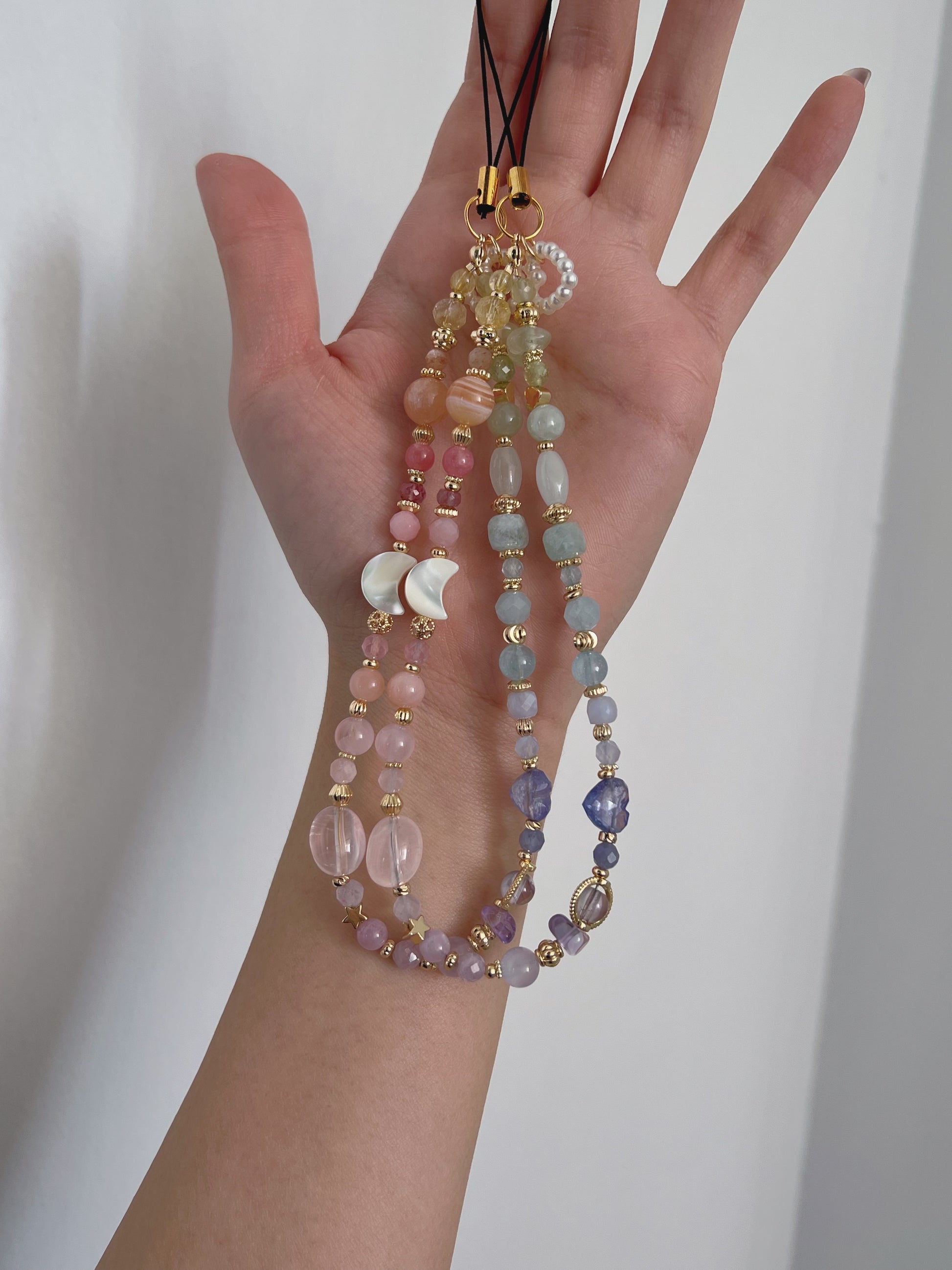Pink Opal, Rose Quartz, Pink Tourmaline, Rhodochrosite, Botswana Agate, Citrine, Spinel, Morganite, Prehnite, Jade, Aquamarine, Blue Lace Agate, Tanzanite, Amethyst, Lavender Chalcedony, Kunzite