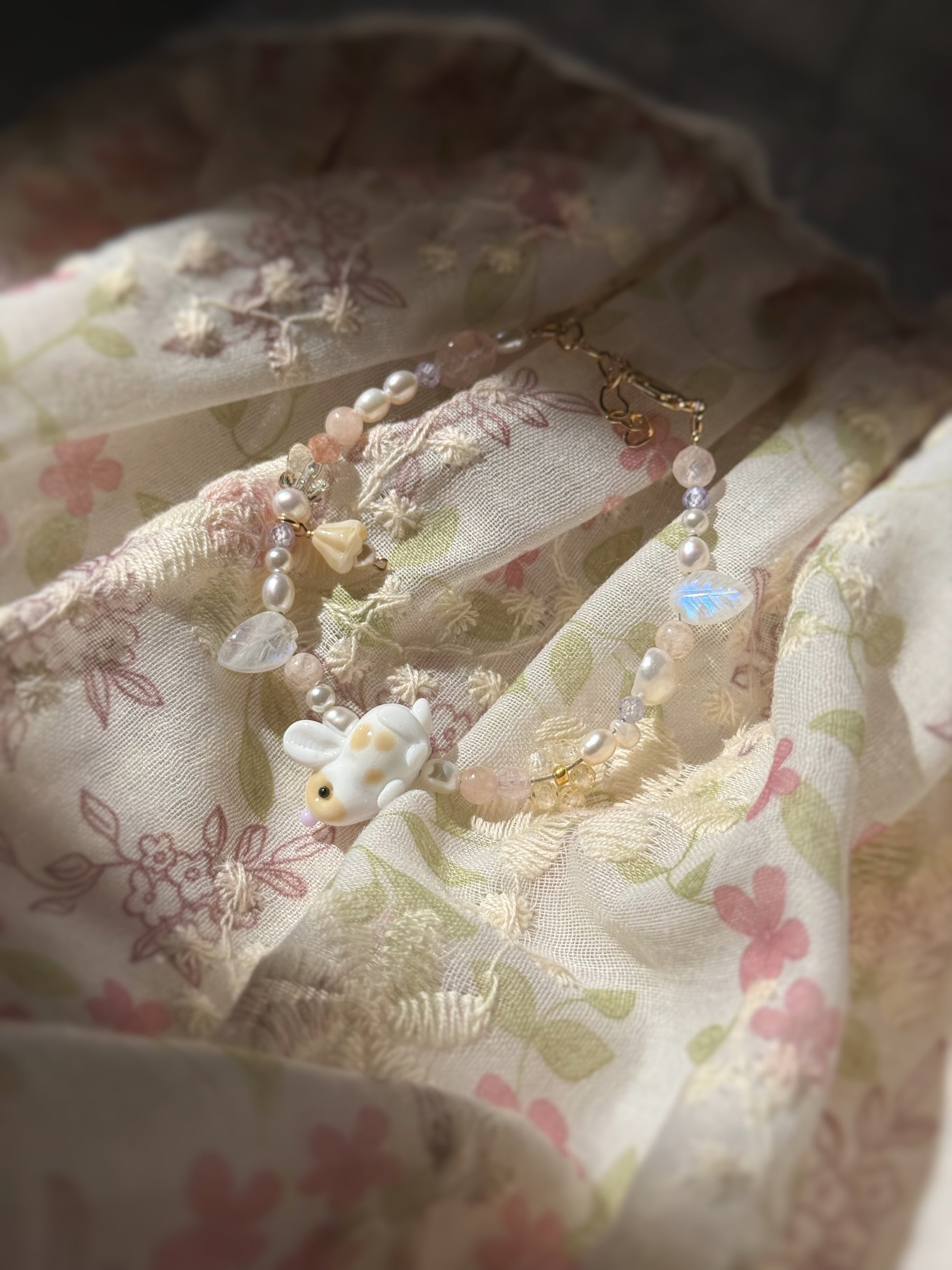 Lampwork glass bunny, moonstone, morganite, spinel, purple & yellow zirconia, pearl, swarovski beads, glass beads.