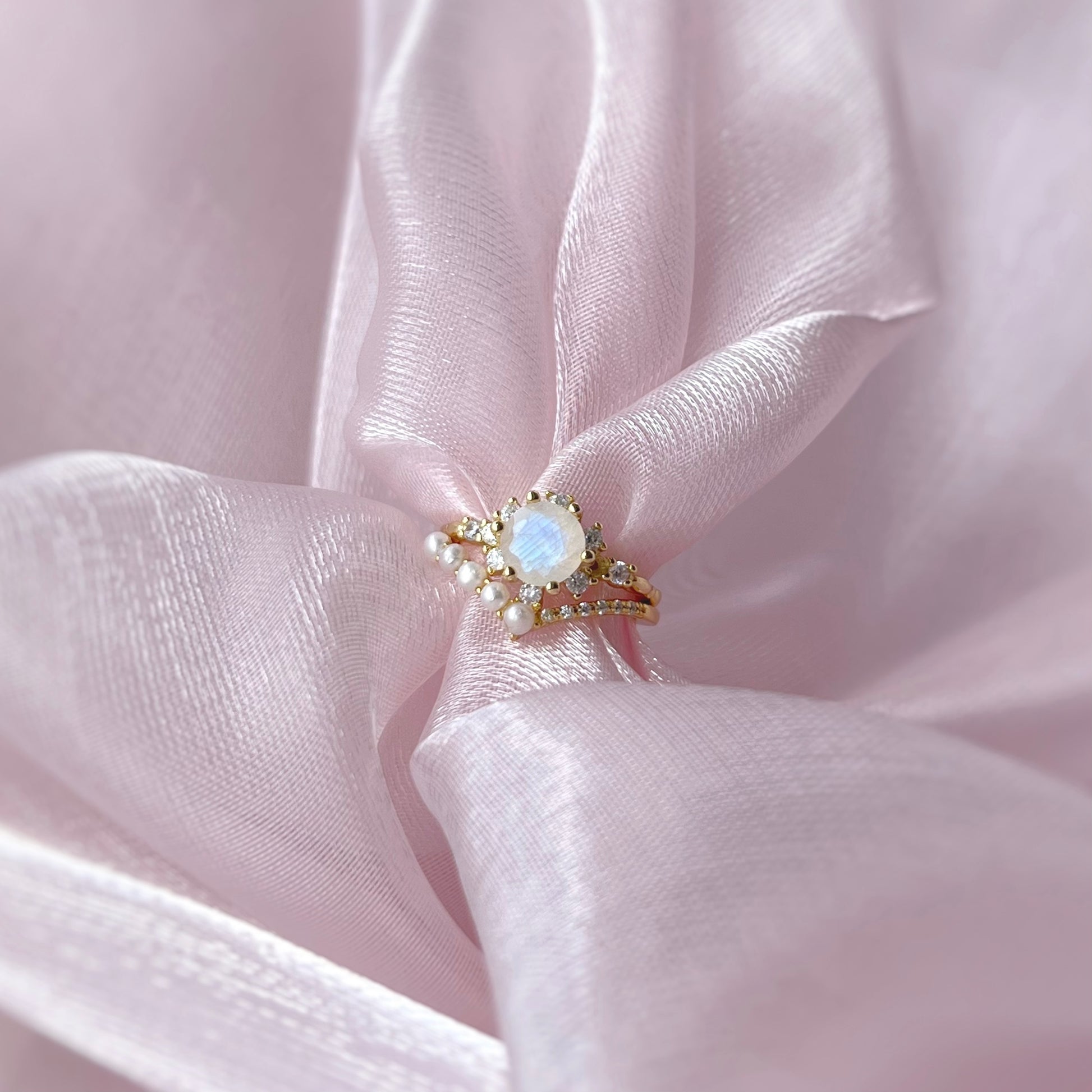 A one-of-a-kind Moonstone ring framed with two mini clusters of sparkling Cubic Zirconias. Our Vivienne Ring comes with a delicate Pearl Stacker that can be worn together or separately.